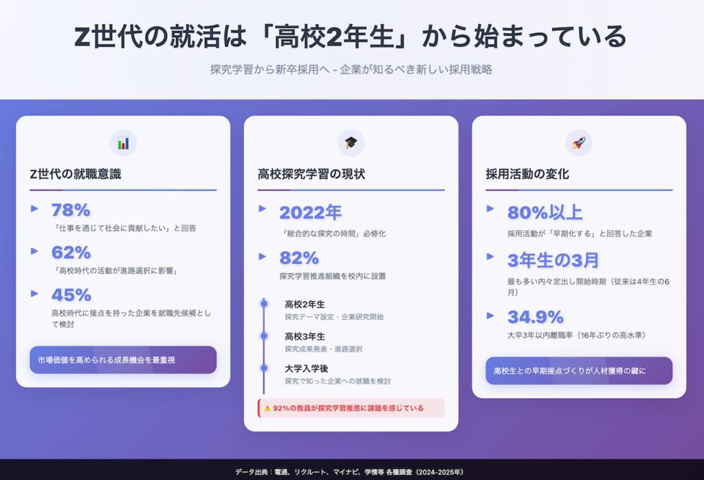2025年現在、新卒採用市場に参入してくるZ世代(1997年〜2012年生まれ)は、これまでの世代とは全く異なる価値観と行動様式を持っています。特に注目すべきは、彼らの多くが高校時代の探究学習を通じて、すでに自分の興味関心や社会課題への問題意識を明確に持っているという点です。