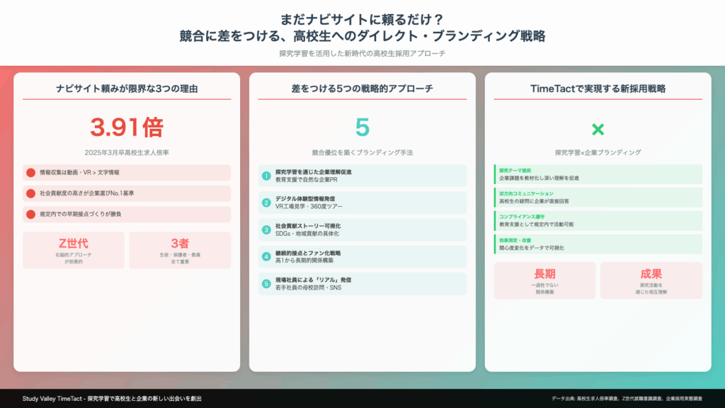 2025年3月卒業予定者の高校生求人倍率は3.91倍という超売り手市場。多くの企業が従来通り求人ナビサイトに掲載し、高校からの推薦を待っているだけでは、もはや優秀な人材の確保は困難です。特に製造業をはじめとした現場作業を伴う業種では、世代交代による人材確保が急務となっています。しかし、高校生採用の厳格なルールに縛られ、多くの企業が手をこまねいているのが現状ではないでしょうか。今こそ、ナビサイト依存から脱却し、高校生へのダイレクトなブランディング戦略で競合に差をつける時です。