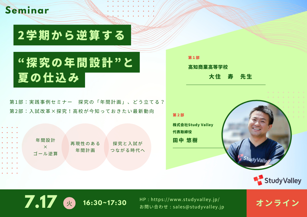 株式会社Study Valleyは、2025年7月17日(木)に中学校・高等学校の教職員および学校関係者を対象としたオンラインセミナー「2学期から逆算する“探究の年間設計”と夏の仕込み」を開催いたします。