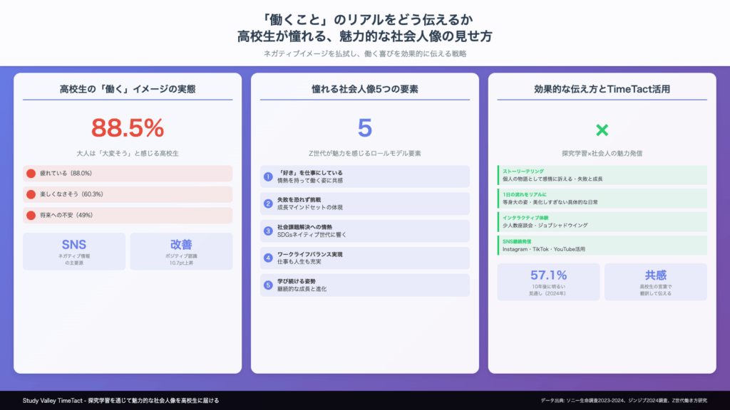 「仕事って大変そう」「会社員になりたくない」――SNSで飛び交うブラック企業の話題や、疲れた顔で満員電車に揺られる大人たちを見て、多くの高校生が「働くこと」にネガティブなイメージを抱いています。しかし、本当の仕事の醍醐味や、やりがいを持って働く社会人の姿は、なかなか高校生には届いていません。本記事では、高校生が憧れる魅力的な社会人像の見せ方と、働くことのリアルな魅力を効果的に伝える方法を解説します。