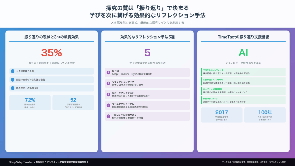 文部科学省の調査によると、探究学習を実施している高校の約72%が「発表会の実施」を重視している一方、「振り返りの時間を十分に確保している」と回答した学校は35%にとどまっています。この数字が示すように、多くの学校で振り返りのプロセスが軽視されているのが現状です。