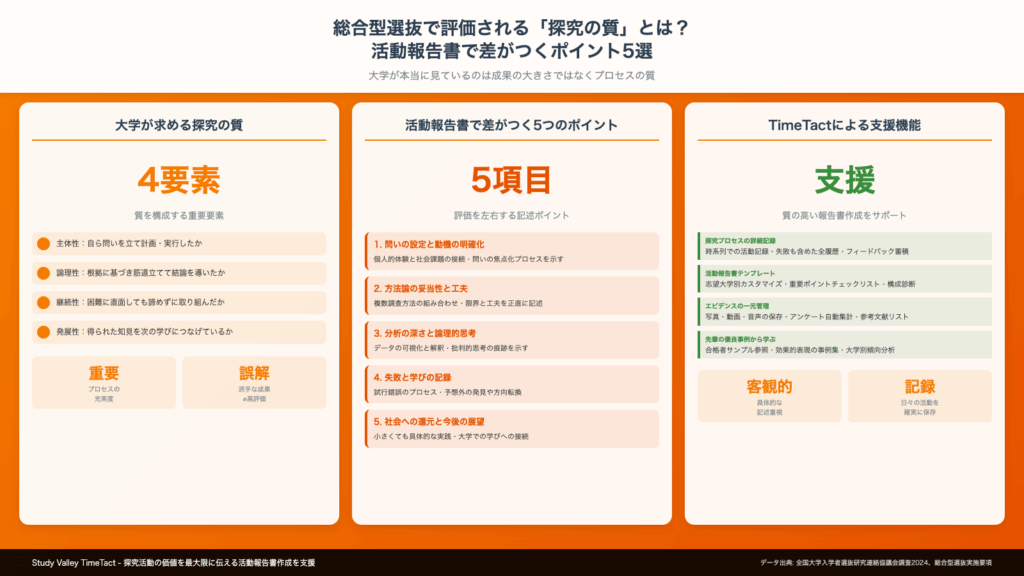 総合型選抜で評価される「探究の質」は、華やかな成果ではなく、探究のプロセスの充実度にあります。問いの設定から始まり、方法論の工夫、深い分析、失敗からの学び、そして社会への還元まで、一連の流れを論理的に示すことが重要です。
