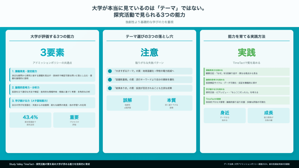 大学が探究活動で本当に見ているのは、「課題発見・設定能力」「論理的思考力・分析力」「学び続ける力」の3つの能力です。これらは、テーマの独創性とは関係なく、どんな探究活動でも磨くことができます。