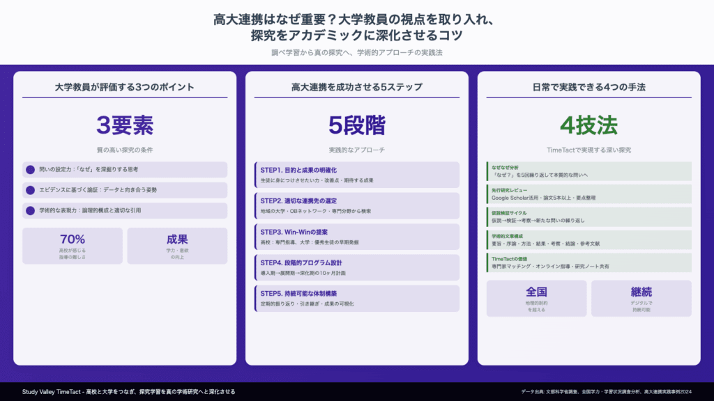 そして、Study Valley TimeTactのようなデジタルプラットフォームを活用することで、地理的制約や人的リソースの限界を超えた、新しい形の高大連携が可能になります。探究学習の可能性を最大限に引き出し、生徒たちの知的好奇心を学術的な探究へと昇華させる。それが、これからの高校教育に求められる姿ではないでしょうか。