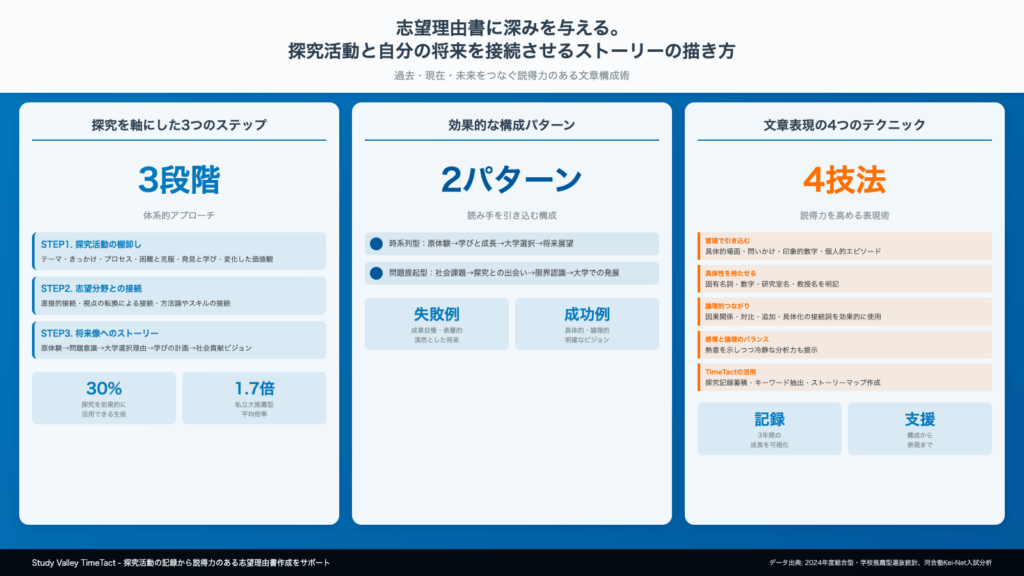 そして、Study Valley TimeTactのようなツールを活用することで、探究活動の記録と振り返りがより効果的に行え、説得力のある志望理由書作成につながります。