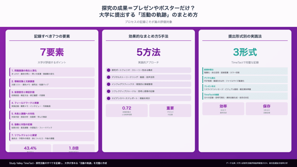多くの高校生が探究活動の成果として「プレゼンテーション」や「ポスター」の作成に注力しています。しかし、大学が本当に見たいのは、華やかな発表資料だけではありません。むしろ、探究のプロセスで何を考え、どう行動し、何を学んだのかという「活動の軌跡」こそが重要なのです。本記事では、大学に提出する探究活動記録の効果的なまとめ方について、具体的な方法とテクニックを解説します。