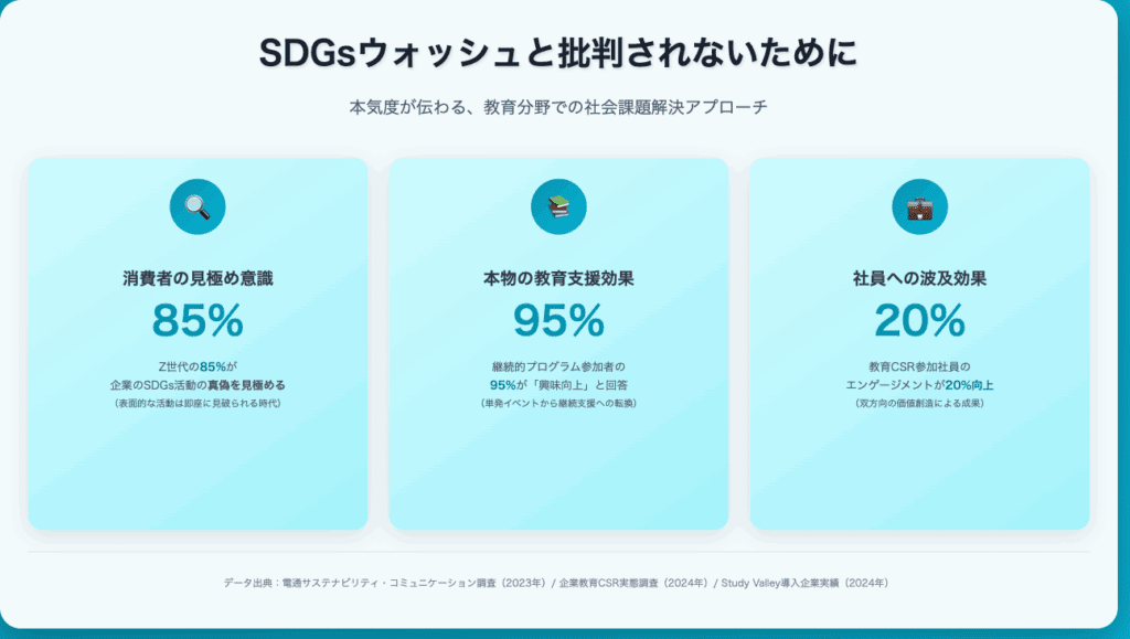 教育分野は、企業にとって比較的参入しやすいCSR活動の領域と見なされがちです。しかし、この安易な考えが、結果的にSDGsウォッシュを生み出す原因となっています。