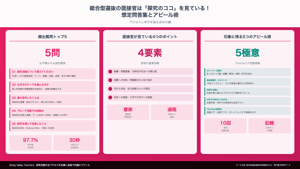 面接官は、あなたの探究活動の「結果」だけでなく、むしろ「プロセス」と「そこから何を学んだか」に注目しています。具体的には:
