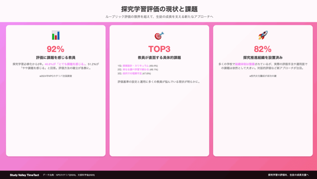 文部科学省の調査によると、探究学習を実施している高校の87%が「評価方法の確立」を最大の課題として挙げています(2025年3月調査)。多くの学校がルーブリック評価を導入していますが、「形式的な評価になってしまう」「生徒の成長が測れない」といった声が後を絶ちません。