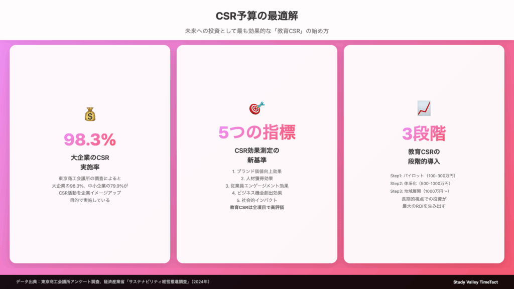 2024年の経団連調査によると、日本企業のCSR予算の平均配分は、環境活動35%、地域貢献25%、文化・スポーツ支援20%、教育支援15%、その他5%となっています。しかし、実際の効果測定では、教育支援が最も高い長期的リターンを生み出していることが明らかになっています。
