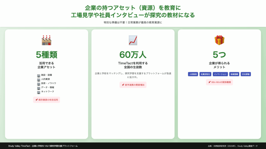 企業の持つアセットは、そのまま高校生の探究学習にとって貴重な教材となります。工場、社員、技術、データ、ネットワークといった既存の資源を活用することで、特別な投資をすることなく、効果的な教育支援を始めることができます。
