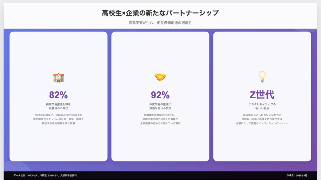 従来の産学連携は、企業が知識や技術を教育現場に「提供する」という構図が一般的でした。しかし、デジタルネイティブ世代である現在の高校生は、新鮮な視点と柔軟な発想力を持ち、企業にとっても貴重な気づきをもたらす存在となっています。探究学習を通じた真のパートナーシップは、企業と高校生の双方に大きな価値をもたらし、社会全体にイノベーションを生み出す可能性を秘めています。
