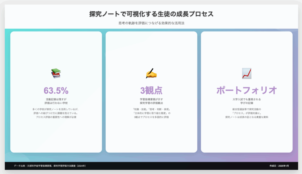 探究ノートは、生徒の思考プロセスを可視化し、真の学びを評価するための貴重なツールです。単なる活動記録ではなく、思考の発展、気づきの瞬間、成長の軌跡が詰まった「宝の山」として活用することで、探究学習の質は飛躍的に向上します。