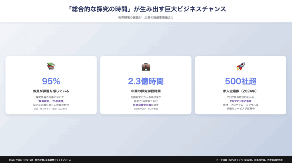 「総合的な探究の時間」は、単なるCSR活動の場ではなく、企業にとって大きなビジネスチャンスです。教育現場の切実なニーズに応える形で自社のシーズを提供することで、社会貢献とビジネス成長を両立させることができます。重要なのは、教育現場の文化を理解し、段階的にアプローチすること。そして、Study Valley TimeTactのようなプラットフォームを活用して、効率的にマッチングを実現することです。今こそ、教育市場への参入を検討する絶好のタイミングと言えるでしょう。