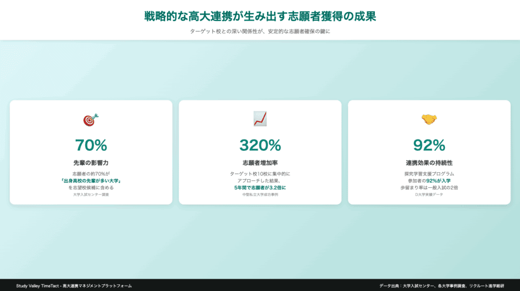 まず、ターゲット校戦略がいかに効果的であるかを、具体的なデータで見てみましょう。大学入試センターの調査によると、志願者の約70%は「出身高校の先輩が多く進学している大学」を志望校候補に含めています。つまり、特定の高校との強固な関係性は、安定的な志願者確保の基盤となるのです。