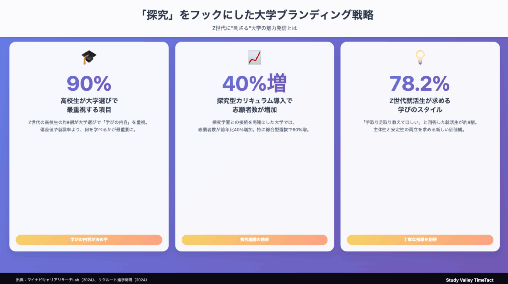 Z世代の高校生にとって、探究は単なる授業の一つではありません。自分の興味関心を深め、社会とつながり、未来を切り拓く重要な活動です。大学がこの探究の価値を理解し、それを軸にしたブランディングを展開することで、真に響くメッセージを届けることができます。