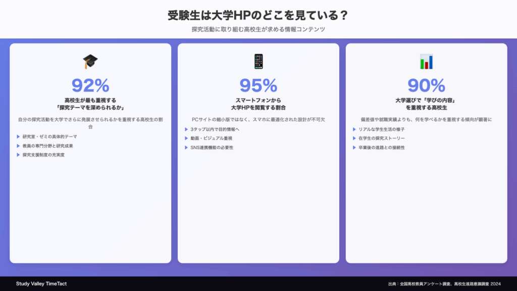 探究活動に取り組む高校生が大学HPに求めるのは、「自分の探究をさらに深められる場所かどうか」を判断できる具体的な情報です。従来型の大学紹介では、もはや彼らの心を掴むことはできません。