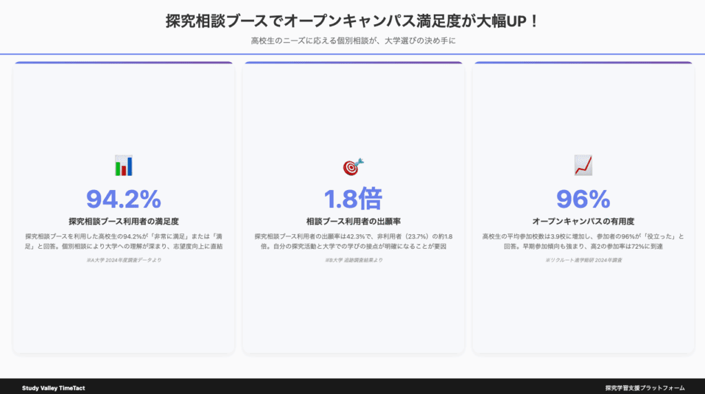 特に、探究相談ブースを利用した高校生の94.2%が「非常に満足」または「満足」と回答しており、個別相談の重要性が明確に示されています。