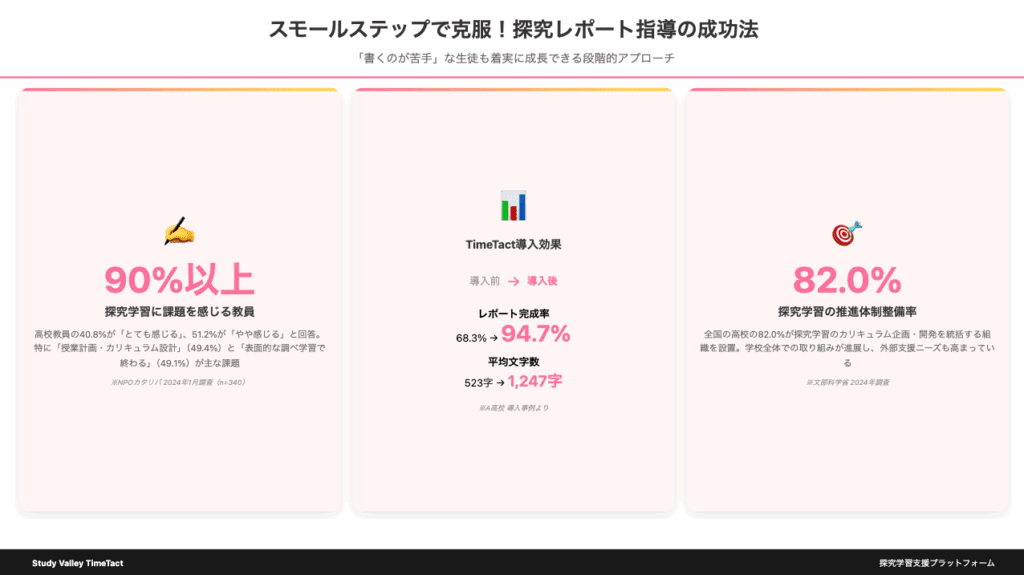 「書くのが苦手」という生徒も、適切な指導とサポートがあれば、必ず探究レポートを完成させることができます。重要なのは、生徒一人ひとりのペースに合わせたスモールステップの設定と、達成感を積み重ねられる環境づくりです。