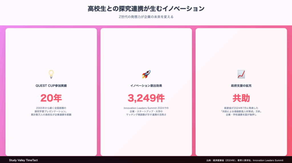 「既存の枠組みにとらわれない発想」「デジタルネイティブならではの着眼点」「社会課題への純粋な問題意識」。高校生との探究連携を通じて、多くの企業が想定外のイノベーションのヒントを得ています。単なるCSR活動を超えた、企業成長に直結する高校生との協働の可能性を、具体的事例とともに解説します。