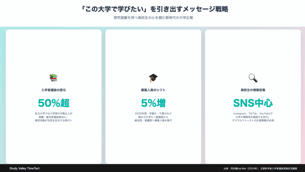 探究学習を経験した高校生は、「自分の問い」を持って大学選びをしています。彼らが求めているのは、その問いをさらに深め、新たな問いを生み出せる環境です。大学は、この期待に応えるメッセージを戦略的に発信する必要があります。