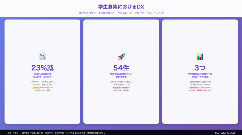 少子化が加速する中、大学の学生募集は年々厳しさを増しています。従来の偏差値や地域を基準とした画一的なアプローチでは、もはや優秀な学生を確保することは困難です。一方で、高校では探究学習が必修化され、生徒一人ひとりの興味関心や学びの軌跡がデジタルデータとして蓄積されるようになりました。本記事では、これらの探究データを活用し、DX(デジタルトランスフォーメーション)によって学生募集を革新する次世代のリクルーティング戦略について詳しく解説します。