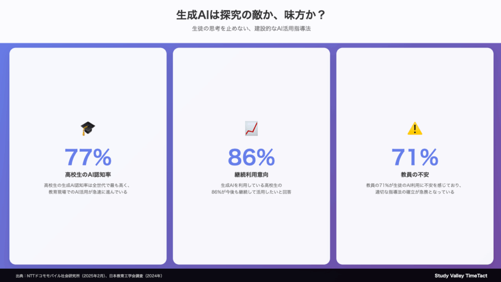 この数字が示すのは、生成AIはすでに生徒たちの学習環境に深く浸透しているという現実です。禁止や制限だけでは対応できない段階に来ています。