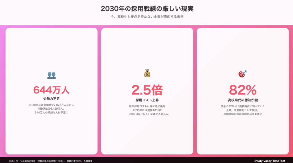 2030年まで、あと5年。これは長いようで、採用戦略を根本から変えるにはギリギリの時間です。今、高校生との接点を持たない企業は、5年後に取り返しのつかない競争劣位に立たされることになるでしょう。