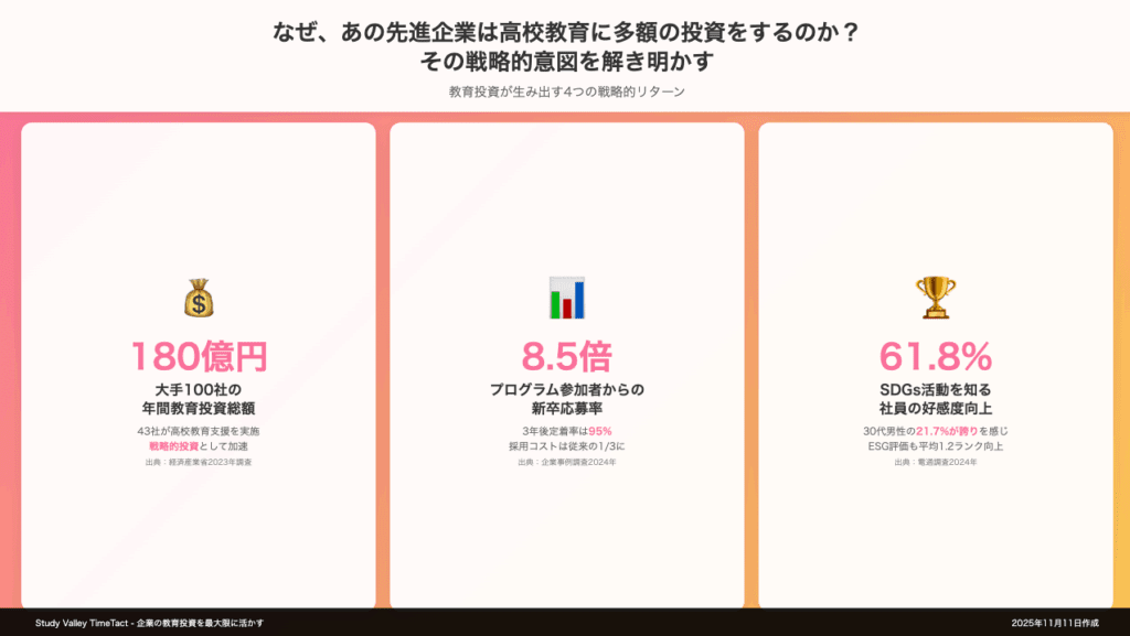 Google、Microsoft、トヨタ、ソフトバンク…名だたる大企業が、高校教育への投資を加速させています。単なる社会貢献活動と思われがちなこの動きの背後には、極めて戦略的な意図が存在します。年間数億円規模の投資を行う企業も珍しくない中、なぜ彼らは高校教育に注目するのか。本記事では、先進企業の教育投資の実態と、その投資が生み出す「見えないリターン」について、具体的な数字とともに解き明かします。