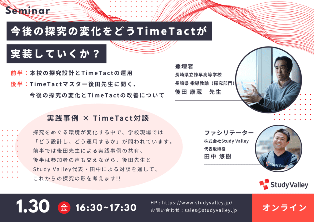 探究学習支援のリーディングカンパニーである株式会社Study Valley(本社:東京都江戸川区、代表取締役:田中悠樹)は、全国の中学校・高等学校教職員や教育委員会関係者を対象に、無料オンラインセミナー『実践事例×対談!今後の探究の変化をどうTimeTactが実装していくか?』を2026年1月30日(金)に開催いたします。