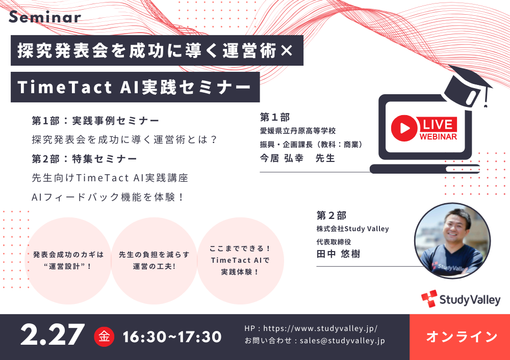 探究学習支援のリーディングカンパニーである株式会社Study Valley(本社:東京都江戸川区、代表取締役:田中悠樹)は、全国の中学校・高等学校教職員や教育関係者を対象に、無料オンラインセミナー『探究発表会を成功に導く運営術×TimeTact AI実践セミナー』を2026年2月27日(金)に開催いたします。