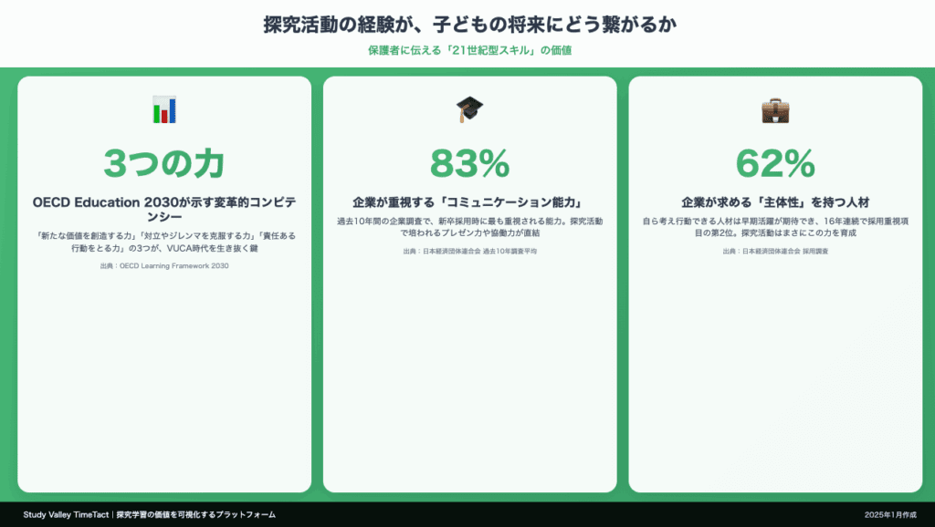 特に重要なのは、探究活動が単なる「新しい教育手法」ではなく、子どもの将来のキャリア形成に直結する重要な学びであることを、具体的なエビデンスとともに示すことです。Study Valley TimeTactのようなツールを活用することで、この価値をより説得力を持って伝えることが可能になります。