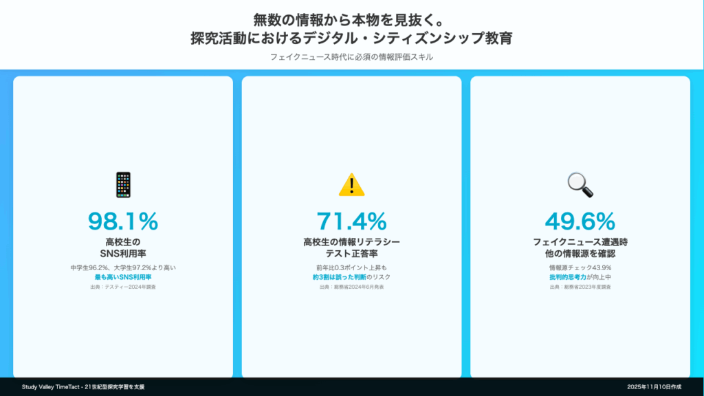 総務省の2023年調査によると、高校生の97.8%がインターネットを日常的に利用し、その主な目的の一つが「調べ学習」となっています。しかし、同調査では高校生の約6割が「ネット上の情報の真偽を判断することが難しい」と回答しており、情報リテラシー教育の必要性が浮き彫りになっています。
