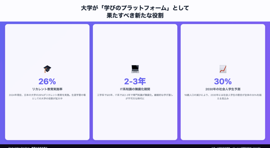 21世紀に入ってから、大学教育を取り巻く環境は劇的に変化しています。文部科学省の調査によると、大学で学んだ専門知識の「賞味期限」は年々短くなっており、工学系では5年、IT系では2-3年で陳腐化すると言われています。このような状況下で、従来型の「知識詰め込み型」教育の限界は明らかです。