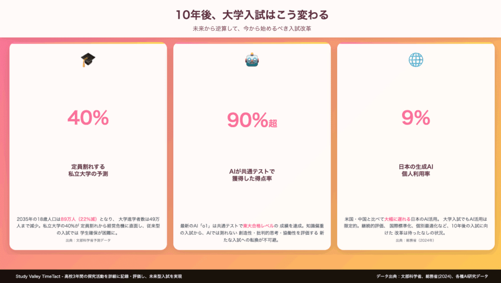 まず、今後10年間で大学入試に決定的な影響を与える構造変化を整理しましょう。
